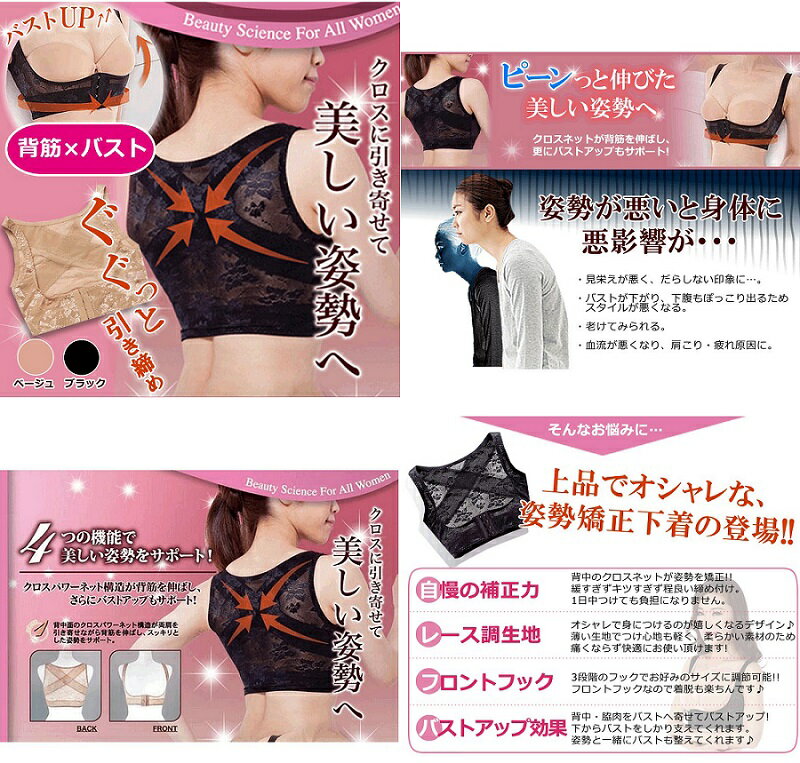 クロスパワーネット構造で背筋を引き伸ばします! 商品には、上品なレース調の生地を使用! ストレッチ性・通気性があり快適な付け心地です♪